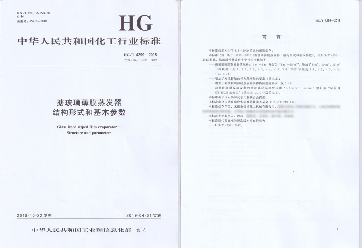 無(wú)錫錢(qián)橋化工機(jī)械有限公司參與起草中華人民共和國(guó)化工行業(yè)標(biāo)準(zhǔn)HG/T 4299-2018《搪玻璃薄膜蒸發(fā)器結(jié)構(gòu)形式和基本參數(shù)》。