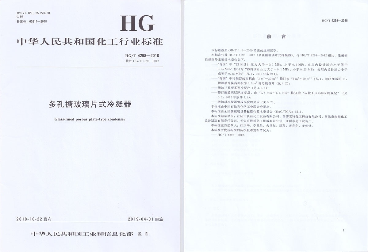 Wuxi Qianqiao Chemical Machinery Co., Ltd. participated in the drafting of the people's Republic of China chemical industry standard Hg / T 4298-2018 glass-lined porous plate-type condenser.