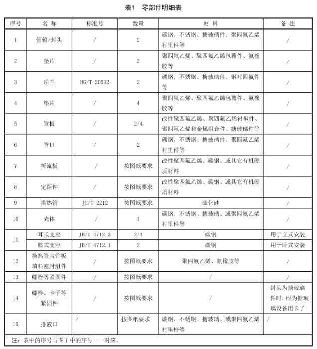 碳化硅換熱器結(jié)構(gòu)型式見圖1,零部件明細表見表1,換熱器主要尺寸標注圖見圖2,主要尺寸表見表2,管口尺寸表見表3,換熱器(換熱管外徑為Φ14 mm)的布管數(shù)及換熱面積表見表4,換熱器(換熱管外徑為Φ19 mm)的布管數(shù)及換熱面積表見表5。