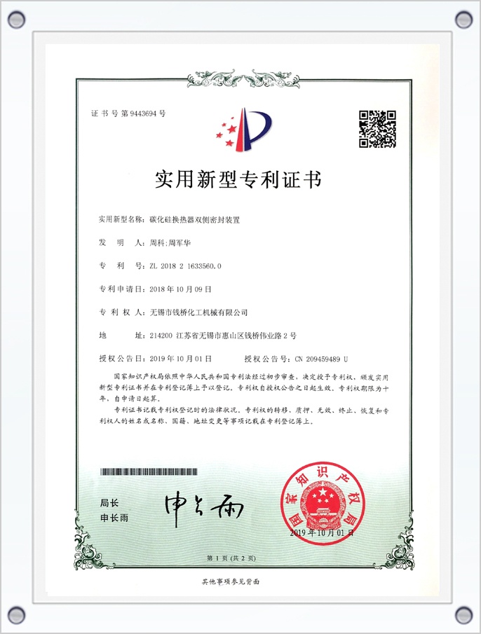 碳化硅換熱器雙側(cè)密封裝置專(zhuān)利證書(shū)