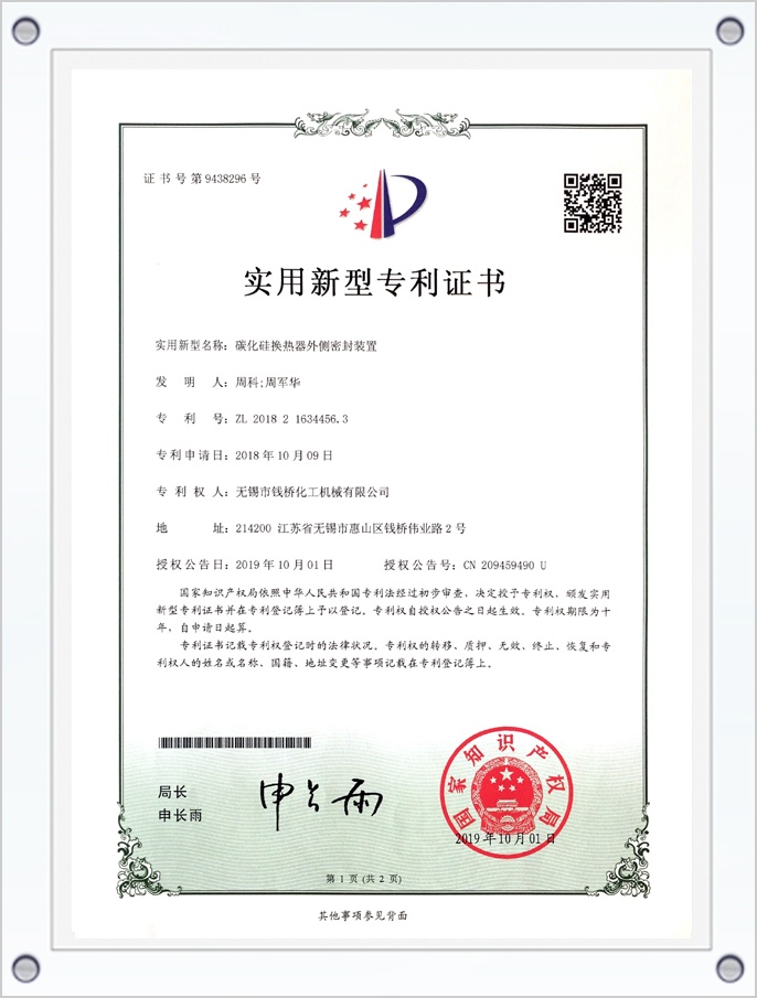 碳化硅換熱器外側(cè)密封裝置專利證書(shū)