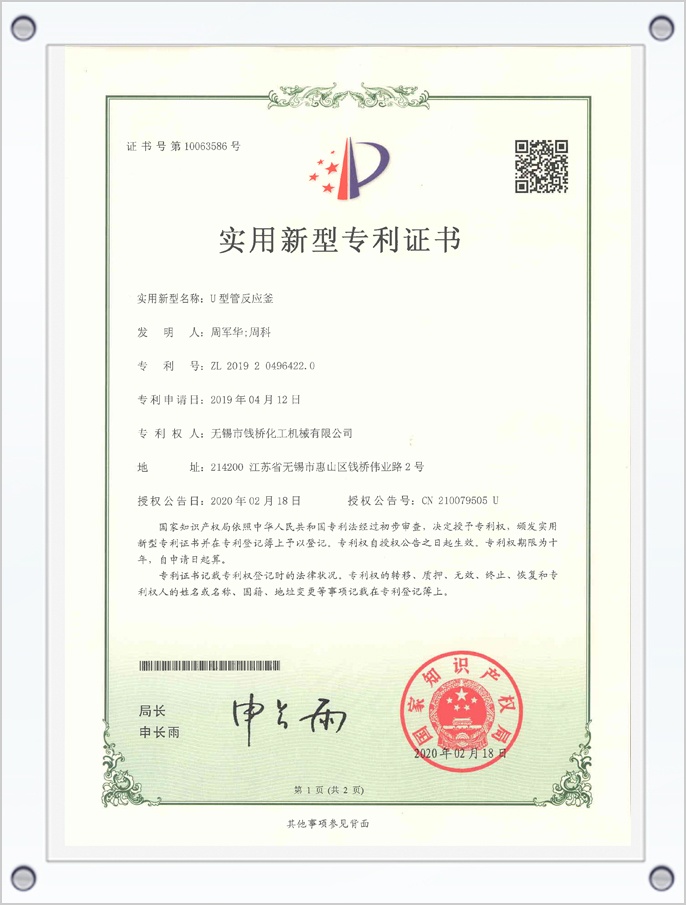 U型管反應釜專利證書