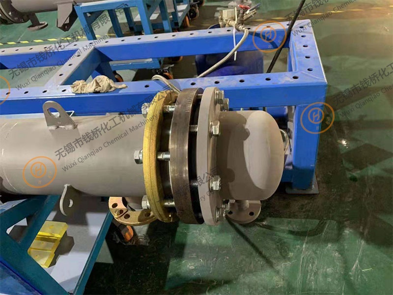 2020-03-05錢橋化工機械發(fā)明公開了一種實用新型碳化硅換熱器鋼襯四氟管板密封裝置,包括第一鋼襯管板、第二鋼襯管板、支撐板、密封部和檢漏部,支撐板設(shè)置在第一鋼襯管板和第二鋼襯管板之間,檢漏部設(shè)置在支撐板上,檢漏部包括在支撐板與第一鋼襯管板接觸的邊緣設(shè)有凸起,以及凸起與第一鋼襯管板之間形成間隙,支撐板頂部設(shè)有檢測管道...